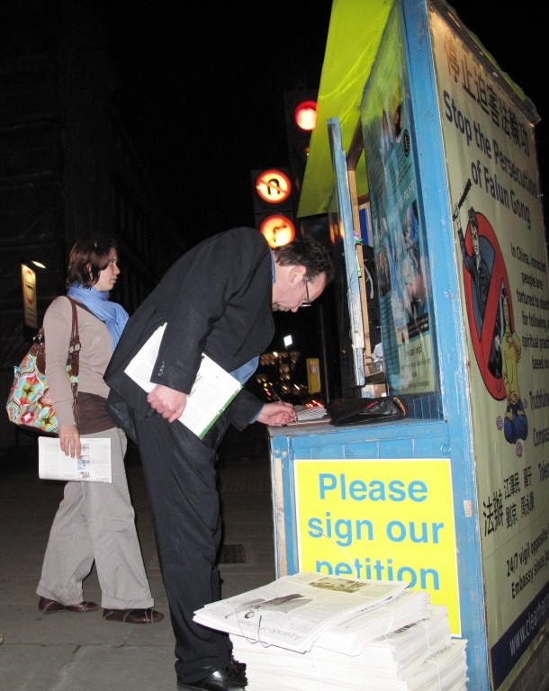 人们在请愿表上签名支持法轮功反迫害