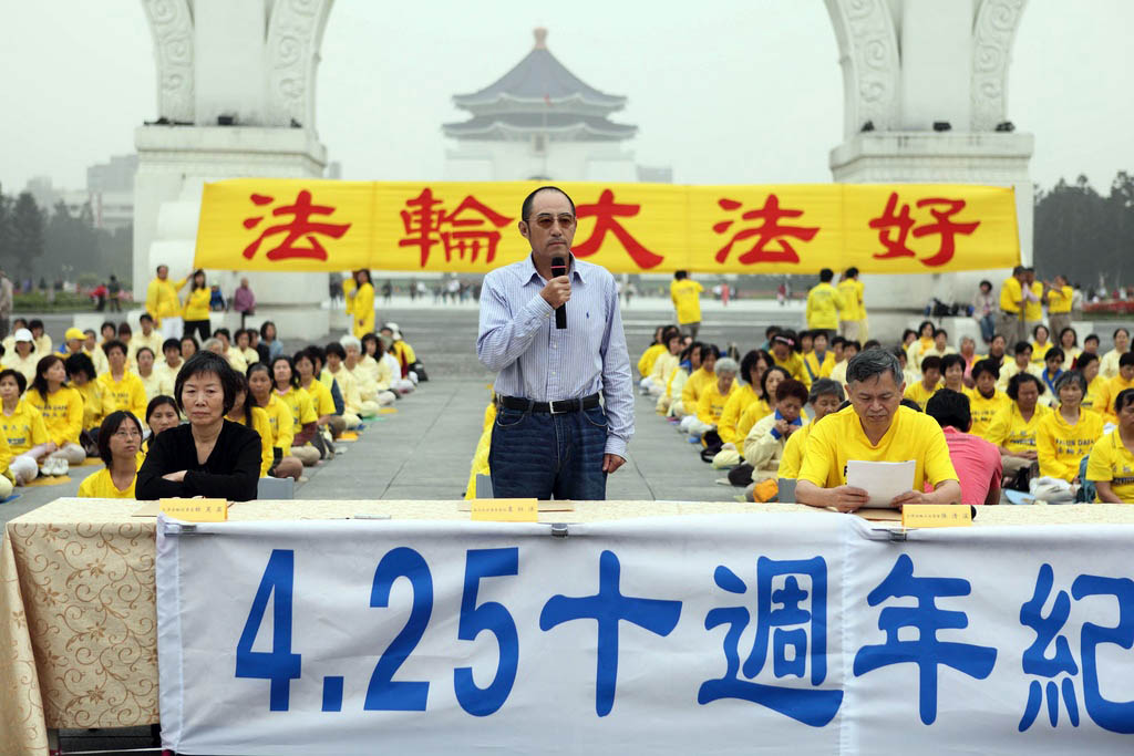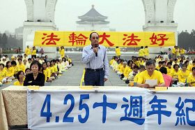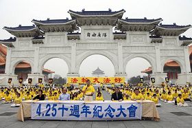 千名法轮功学员在台北市“自由广场”前举行“四•二五十周年纪念大会”