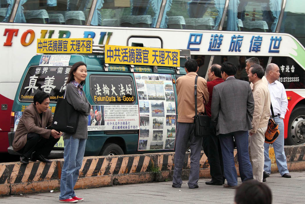大陆游客聚集在自由广场前观看法轮功真相广播车内容
