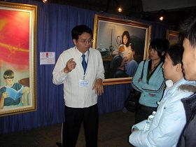 刘先生带着女友廖小姐来莺歌玩,刘先生说:“刚来的时候,有人发美展的传单给我们,我们就进来看了。”刘先生说:“之前虽然有听过法轮功,不过不是很清楚,看过这些画再加上导览人员的解说之后,我们对法轮功的认识更深入了。”刘先生对法轮功的印象很不错,也觉得画作中那些中共用来迫害法轮功的手段太残忍,他说:“其实,像我去日月潭玩,也有看到有人在炼法轮功啊,台湾跟大陆不一样,台湾是自由的。”