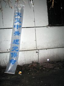 4月24日晚,黑龙江大法弟子为纪念10年前4.25法轮功学员和平大上访,为了让人们了解真相,出外悬挂条幅,条幅上写有“法轮大法好”、“世界需要真善忍”、“天灭中共 退党保命”。