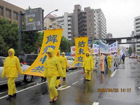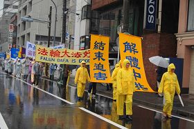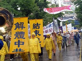 下午两点在雨中法轮功学员开始在横滨市内两个小时的游行。游行队伍由天国乐团作先导,许多学员手举“解体中共 结束迫害”、“法轮大法好”等横幅,队伍中还有学员通过扩音器一遍遍反复地向路人介绍什么是法轮功和法轮功遭受中共迫害的真相。人们看到这支在雨中行进的队伍非常关注,纷纷驻足观看,天国乐团冒着大雨的演奏更是令人震撼。