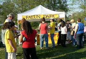 在法轮功学员的展位上,法轮大法的中英文书籍整齐地排列在桌上,伴随着悠扬的音乐演示功法的学员给路过的人们带来一种圣洁和安详的感觉。人们自然而然地停住脚步,接过传单,一探究竟。听学员们讲到法轮功在中国无辜被迫害的真相,很多人毫不迟疑地在反迫害征签本上写下了他们的名字。