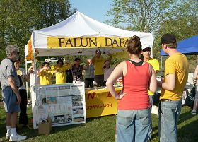 一个年轻女子,一手拿着啤酒瓶,似乎是无心地转到法轮功学员的展位,听了大法在中国无辜遭到迫害的真相,她马上在反迫害签名簿上签下了自己的名字。当听说修炼法轮功能够使身心得到健康的同时,精神得到升华,从而使人生得到改变。她马上表示想学法轮功。她讲述了自己生活的种种的压力,无以解脱,只好以酒精来使自己麻醉。学员告诉她,可以上网去读一读《转法轮》这本书,因为修炼首先就是要按照“真善忍”做一个好人。她一听“真善忍”,顿时眼睛发亮,说,“真善忍,我很喜欢这三个字。”不一会儿,她的男友来找他,她对男友说,“你也应该炼法轮功,你的肩膀就会好。”小伙子对学员说他的双肩因受过伤,现在常常疼痛难忍。他从学员手中一接过法轮功的真相传单,马上埋头读了起来。俩人很高兴知道这个公园有炼功点,“学这个功需要多少钱?”当他们听说不需要交钱时,既惊讶又兴奋。他们表示,会在周末到炼功点来学功。