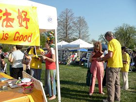 在法轮功展位前停留的人非常多,有要求学功的,有想了解迫害真相的。身材高大的非裔美国人拉尔夫(Ralph)兴奋地来到展位前,他告诉学员,自己曾炼过法轮功。他在网上找到《转法轮》,并跟着教功录像学功法,自己炼了一年多。因为没有找到炼功点,这几个月没有坚持。今天,他一眼看到金黄色的“法轮大法好”横幅,就异常的高兴。他兴奋地描述自己炼法轮功的感受:“我刚一开始炼功,身体就往上冲,太神奇了!”学员告诉他,在这个森林公园有一个法轮功炼功点,他连连说,太好了。