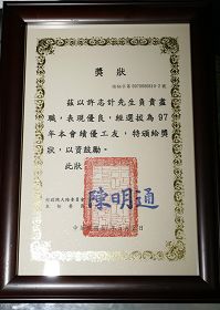 ![]() 许志计于二零零八年五月七日荣获绩优员工奖项 |