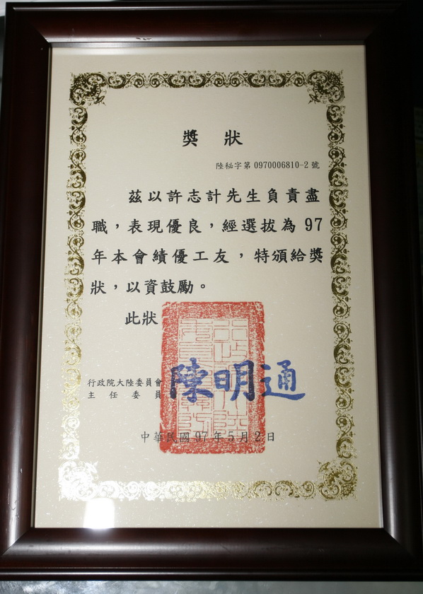 二零零八年五月七日,许志计因乐于助人,工作表现优异,深受长官肯定,获颁绩优技工、工友奖。许志计说,他要将这份殊荣献给法轮大法,是李洪志老师的法理让他的生命重获光明,“我以前是火爆浪子,讲话很冲,长官与同事都忍受过我的脾气。我修炼后,脾气改了很多,只要我有能力,都会主动去做事,主动去帮忙”。