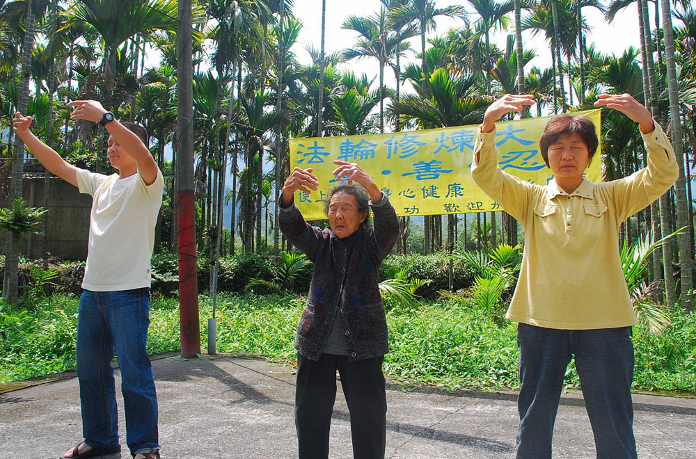 这一天,阿嬷特别随着媳妇、孙子,穿过椰子树下的乡间小道,健步走到土地公庙广场的炼功点,一家三代炼起法轮功的五套功法。和煦的阳光里,阿嬷布满皱纹的脸上显露出的是宁静祥和,我为她们拍下了珍贵的照片。