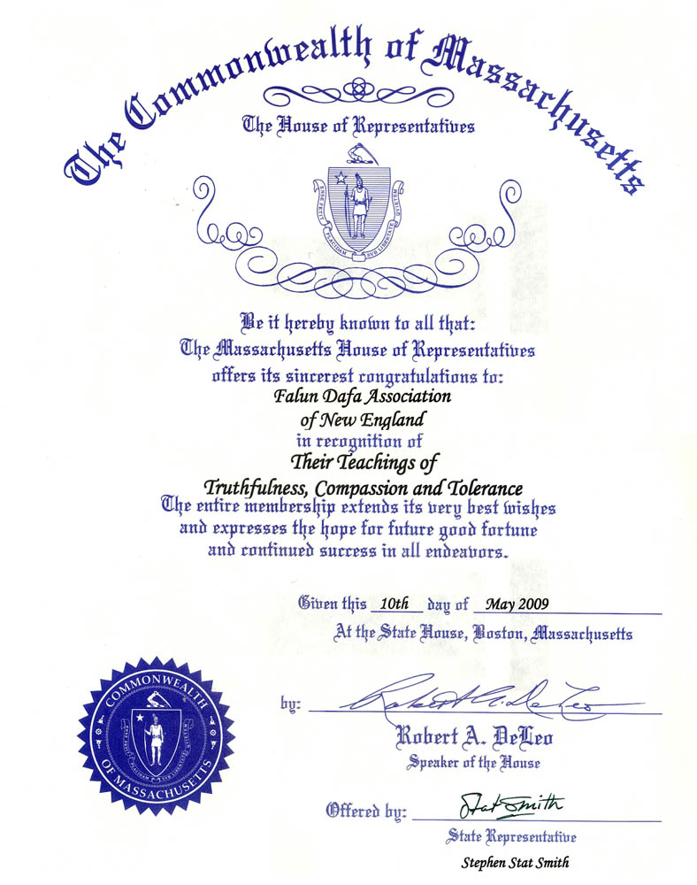 麻萨诸塞州众议院向新英格兰法轮大法协会致以最衷心的祝贺!