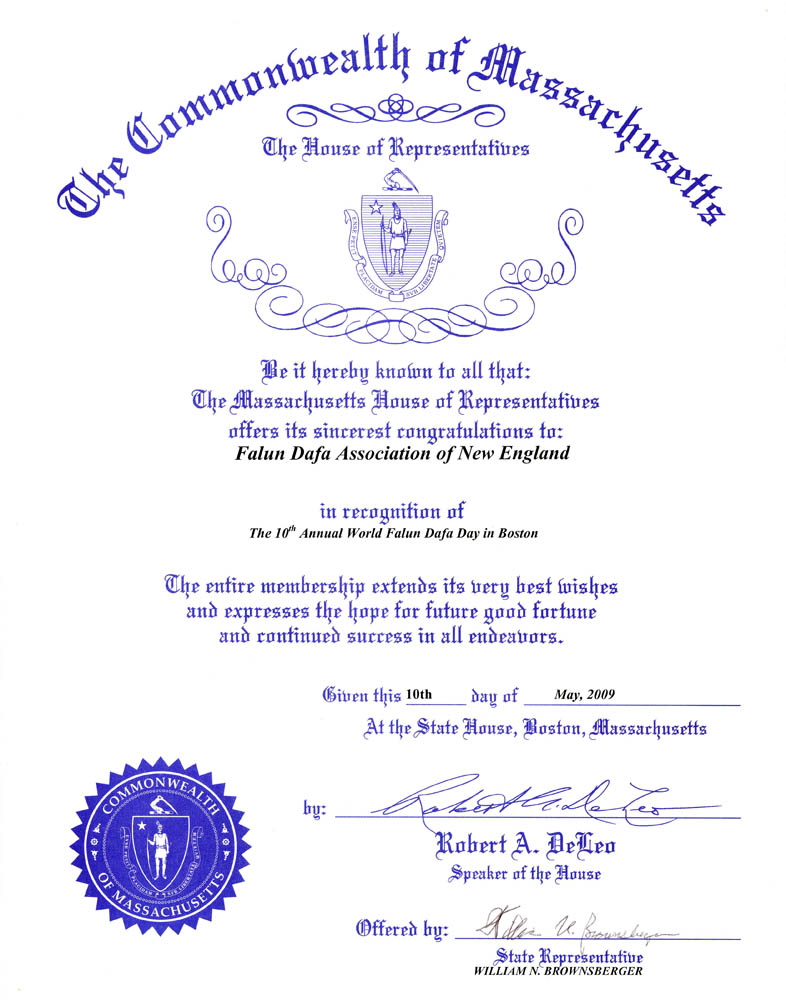 【明慧网二零零九年五月十日】美麻州众议员威廉姆•布朗斯伯格 (William N. Brownsberger)褒奖新英格兰法轮大法协会,并祝贺第十届世界法轮大法日。