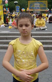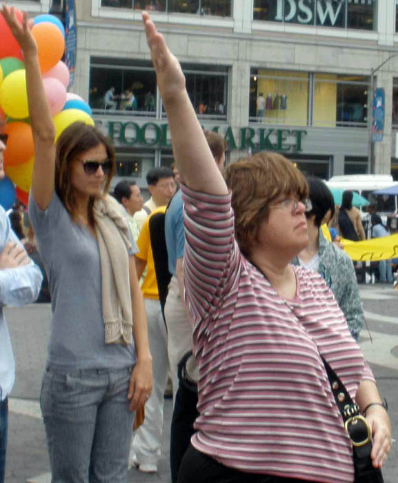 瑞吉纳•奈姆尼女士(Regina Nemni)静静地注视着这个由各族裔、不同背景、从四~五岁到九十多岁的人们组成的炼功场,久久不愿离去。第一次接触法轮功的瑞吉纳说:“他们是那么的祥和,这令我感动。他们能够在喧嚣的广场上深深地入定,其中有一种力量打动着我的心灵。他们带给这个世界的是人类的希望。”