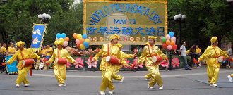 在“世界法轮大法日”这个特别的日子,法轮大法学员不仅以传统的民间舞蹈《狮子舞》、《龙舞》、《腰鼓》,把欢乐的心情传达给世人,还以武术、汉服表演等弘扬传统的中华文化。