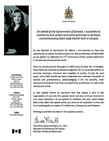 二零零九年五月十三日是法轮功洪传世界十七周年纪念日、也是第十届“世界法轮大法日”,多位加拿大联邦政府部长和国会议员发出贺信,代表加拿大政府颂扬法轮大法“真、善、忍”法理,感谢法轮功修炼者在全世界范围和加拿大传播实践“真、善、忍”的美好使整个社会受益,感谢法轮功修炼者在中共镇压面前表现出的坚韧不拔和对人性尊严的不懈追求。