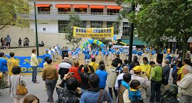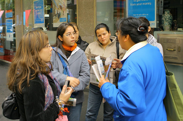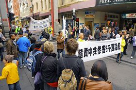 五月九日早上,深秋的墨尔本已颇有一番寒意,天空中飘着小雨,早上八点不到,学员们就集中在著名的旅游景点菲玆洛伊花园集体炼功。中午十二点,游行队伍从城市广场正式出发。腰鼓队击打着欢快的鼓点开路,“庆祝世界法轮大法日”的大型金色横幅与多面耀眼的标语烘托出一股神圣庄严的气势。游行中有功法展示、雍容华贵的唐装仕女、鲜艳的扇子舞、一片美好、祥和的气氛。街道两旁满是驻足观看的路人,共同分享法轮大法洪传于世给生命带来的喜悦与希望。游行中的酷刑展、模拟演示中共活摘器官等方阵,向民众展示了目前在中国所发生的残酷迫害,并传递出一个强烈的讯息:中共迫害法轮功已经十年了,现在必须马上停止。