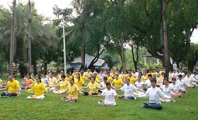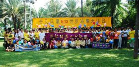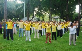二零零九年五月十日,泰国法轮功学员聚集在曼谷是乐园,庆祝第十届世界法轮大法日,感念师尊的慈悲苦度,并恭祝师父生日快乐。早上开始,是乐园飘荡着祥和的炼功音乐,晨光清风中,法轮功学员开始了集体炼功,优美的功法吸引着人们的视线。