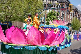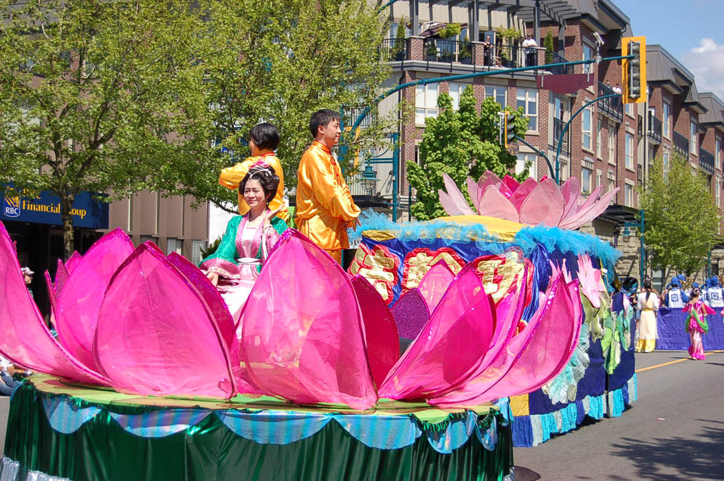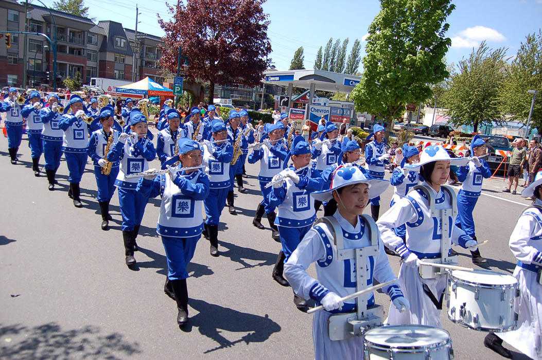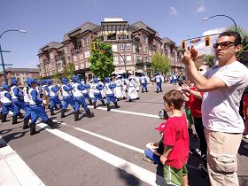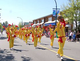 【明慧网二零零九年五月十一日】二零零九年五月九日,加拿大温哥华法轮功学员应邀参加高贵林市(Port Coquitlam)的“五月天”社区庆祝活动,整个游行队伍中法轮大法(又称法轮功)方阵气势最大,也是最受欢迎的队伍。天国乐团开路,后面依次是莲花花车、舞蹈队与腰鼓队。