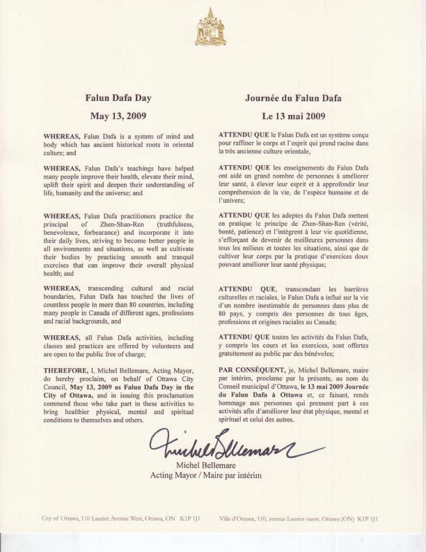 因此,我,渥太华代理市长麦克·贝里麦(Michel Bellemare)代表市议会宣布二零零九年五月十三日为渥太华法轮大法日,并将此褒奖令颁发给将更健康的身、心、灵带给自己和他人的人们。
