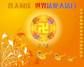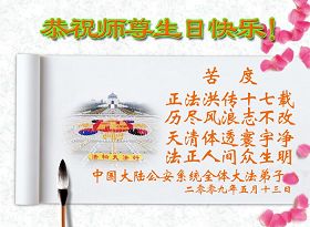 - 大陆弟子敬贺大法开传十七周年(九,逾240地区)- 辽宁盘锦全体大法弟子恭贺世界法轮大法日!河南郾城全体大法弟子恭祝师父生日快乐!云南大法弟子恭祝师尊生日快乐!云南全体大法弟子恭祝师尊生日快乐!江西南昌大法弟子庆祝世界法轮大法日!黑龙江大法弟子恭祝师尊生日快乐!辽宁沈北新区大法弟子庆祝法轮大法日!叩拜师尊生日快乐!北京朝阳大法弟子敬祝师尊生日快乐!四川乐山全体大法弟子恭祝师尊生日快乐!师父好!广西北海大法弟子恭祝师尊生日快乐!陕西全体大法弟子恭祝师尊生日快乐!并祝世界法轮大法日!敬爱的师尊:陕西全体大法弟子感谢师尊慈悲救度,我们决心抓紧做好三件事,救度更多的世人,以报师恩。