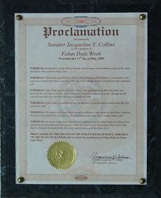 - 伊利诺伊州参议员柯林斯褒奖法轮大法周- 第十届世界法轮大法日到来前夕,二零零九年五月十一日,美国伊利诺伊州参议员杰奎琳·柯林斯颁发褒奖,在法轮大法周向法轮大法学员们致以敬意。