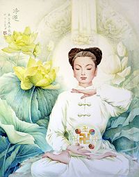 ![]() 此图为真善忍美展的作品《净莲》,表现法轮大法修炼者在打坐中静穆美好的场面,少女头顶是她的功柱。 |