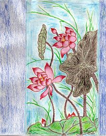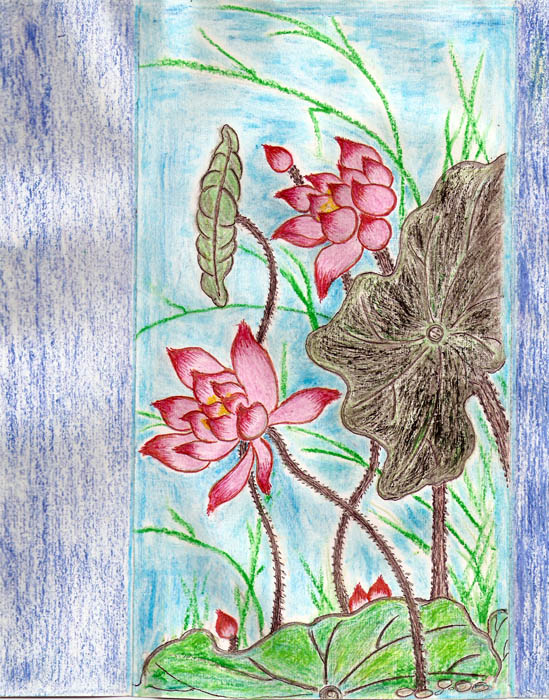 此图为真善忍美展的作品《净莲》,表现法轮大法修炼者在打坐中静穆美好的场面,少女头顶是她的功柱。