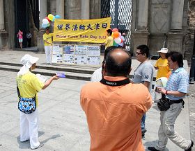 【明慧网二零零九年五月十四日】澳门有两个法轮大法真相点,一个在中区闹市步行街玫瑰堂前地,一个在澳门地标大三巴前地,其中大三巴前地的真相点每天开放,向中外游客,尤其是大陆游客讲真相、劝三退(退出中共党、团、队)。