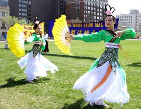 |  法轮功学员表演扇子舞,欢庆世界法轮大法日 |
