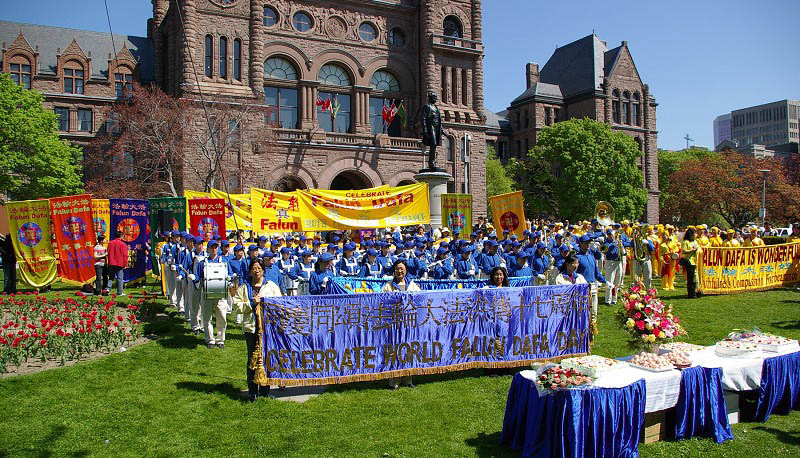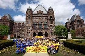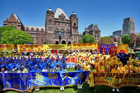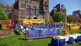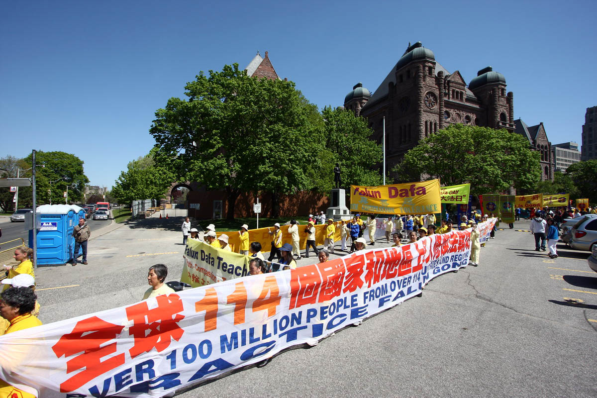 【明慧网二零零九年五月十四日】(明慧记者章韵多伦多报道)二零零九年五月十三日上午,风和日丽的加拿大多伦多迎来了一年一度、普天同庆的世界法轮大法日,法轮大法(法轮功)洪传十七周年,也是法轮大法创始人李洪志先生五十八岁华诞。在这个特别的日子里,法轮功学员在多伦多皇后公园的安省政府大楼前举行了盛大的集会及游行。