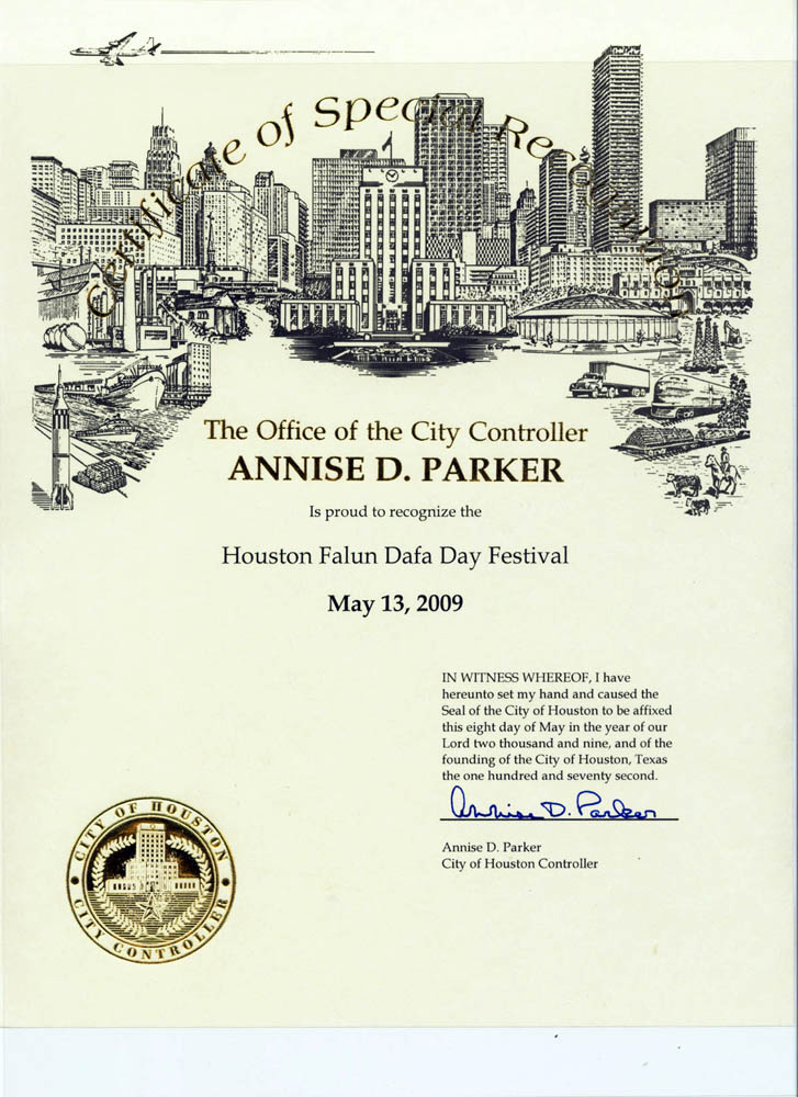 【明慧网二零零九年五月十五日】二零零九年五月十三日暨世界法轮大法日来临之际,美国休斯敦市政府主计办公室主计长安妮丝•派克贺“世界法轮大法日”,庆贺奖状译文如下:
