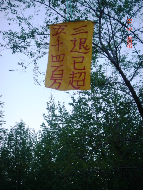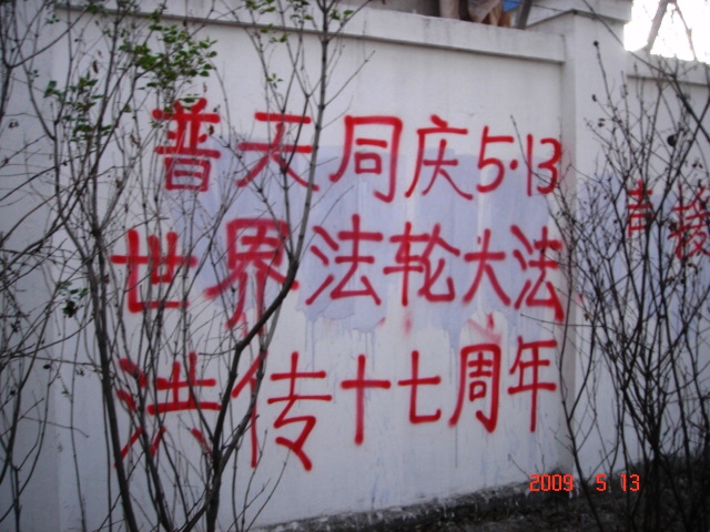 这些条幅、喷漆标语有:“普天同庆5.13 庆祝法轮大法洪传世界”、“庆祝5.13法轮大法日”、 “退党保命”、“声援五千四百万人退党”、“法轮大法好”、“迫害佛法,天理不容”、“天要灭中共,你还犹豫什么?”。