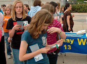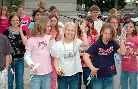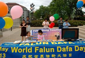 【明慧网二零零九年五月十五日】美国明尼苏达州双子城法轮功(法轮大法)学员于二零零九年五月十三日在州政府前及州府中央大厅举行活动,庆祝世界法轮大法日暨师尊华诞。学员们展示了功法,向人们讲述中共迫害法轮功的真相,并教孩子们叠纸莲花。