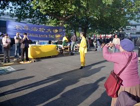 法轮功学员王女士遇到一位中年德国男子,他自述曾经短暂地在中国的一所学校教过书,当时一位中国女老师突然不来上课了,私下里,他听说这位老师是修炼法轮功的,被开除了,但是他的中国同事们都不敢多谈这件事情。当他和夫人在柏林市中心看到法轮功学员的摊位时,他们驻足观看法轮功学员炼功,并向学员询问了很多有关中共迫害的事情。他不无担心地说:“不知道那位教师后来是不是也被关进监狱了。”在法轮功学员向他们讲述了中共活摘法轮功学员器官的事情后,他们立刻签名敦促德国政府要求中共释放所有法轮功学员。签完字后,他指着签名表说:“这个非常重要!”