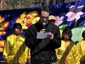 ![]() 西人法轮功学员Dane Crocker在发言时感谢师尊李洪志老师把宇宙真理传给了世人 |