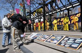 ![]() Suea Wright在观看介绍法轮功洪传世界的展板 |