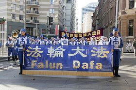 走在游行队伍最前方的第一个方阵是雄姿威武的法轮大法天国乐团方阵,《法轮大法好》、《法鼓法号震十方》、《法正乾坤》等乐曲回荡在人们的耳畔;鼓乐雄壮有力,震撼着人们的心灵;展现了法轮功学员的铮铮骨气和顽强的生命力。他们整齐的队伍、雄壮威武的气势,整齐的队列与步法,以及充满活力的乐曲,赢得了人们的赞赏。尤其这些法轮大法修炼者流露出的祥和、奕奕神采,引来不少路人的钦佩目光。