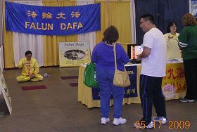 在参展的近百个展台中,法轮大法介绍展位是唯一的义务项目。宽大的横幅、丰富的展板、悦目的莲花、以及优美的音乐,吸引着观众。参展的人们绝大多数是白人,九成以上的人都是头一次听说法轮大法。当学员介绍法轮大法的法理、功法、“真善忍”的内涵,以及大法对身心健康的作用,人们都表示高度认同。