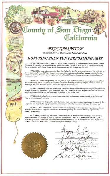 ![]() 圣地亚哥县行政委员会全体成员通过褒奖决议,将“二零零九年五月二十六日至二十八日”命名为“神韵艺术日”。 |