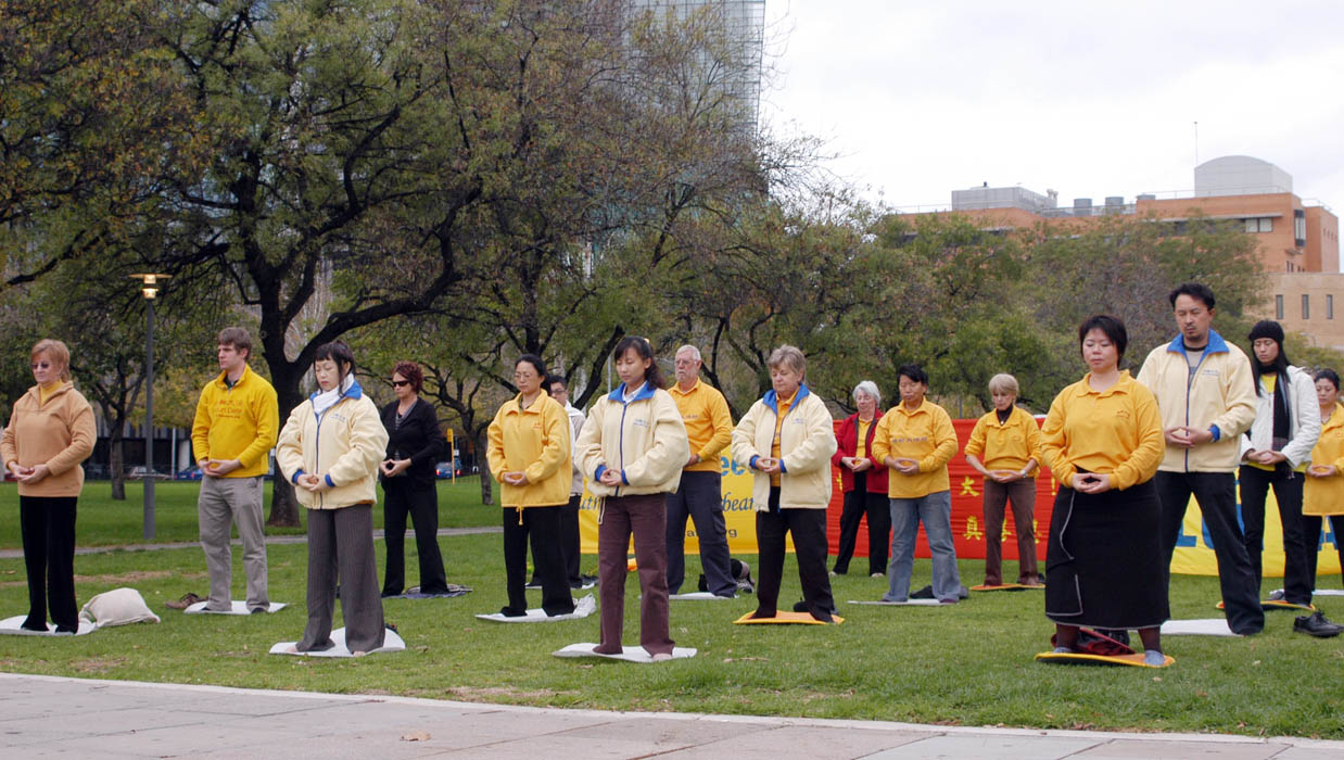 二零零九年五月九日,南澳法轮功学员在州府阿德雷得市中心的维多利亚广场上举行活动,向人们介绍什么是法轮大法,并揭露中共对法轮功修炼者的残酷迫害。学员们的集体炼功,动作整齐美观,吸引不少路人驻足观看或询问详情。学员们向路人发放资料,讲述修炼大法的美好,揭露在中国法轮功学员无辜受中共迫害的真相。路人和游客了解了法轮功真相,不少有缘者想要学习功法,华人明真相后纷纷三退(退出中共党、团、队),谴责中共的暴行。
