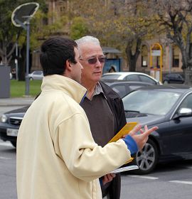 一位从中国国内刚来澳不久的中年男子坐在广场的长椅上观看很久,学员走过去跟他打招呼。他问:“法轮功在这搞活动没人管?”学员告诉他,活动是经政府部门批准的,受法律保护。现在除了中共反对法轮功,全世界已经有一百个国家和地区在洪传法轮大法;法轮大法的书已经被翻译成三十八种文字;各国政府、组织给法轮功颁发的褒奖上千项。就是在中国大陆,打压法轮功也不得人心,通过法轮功学员的讲真相,不少警察也开始觉醒,选择不参与迫害,有的还公开站出来揭露中共。学员给他举了陈用林和郝凤军的例子,这位男士表示以前没听说过。学员给他讲《九评共产党》和“三退”(退出中共党、团、队)大潮,他很愿意听。