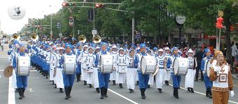 当天国乐队在市府大楼前的观礼台前演奏“法轮大法好”时,主持人高声对大家说:“法轮大法好”的乐曲传入九霄,大法的福音飘入心扉。天国乐团为当天最庞大的乐队。