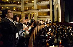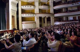 ![]() 演出结束时,观众纷纷起立鼓掌,演员谢幕两次,观众才恋恋不舍的离去。 |