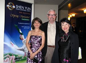 ![]() 圣地亚哥的医生丹尼尔(Daniel Marnell)与太太琦宇(Kieu)(右)、和朋友特惠(Thuy)(左)都表示非常喜爱神韵演出。琦宇并对神韵心怀感恩。 |