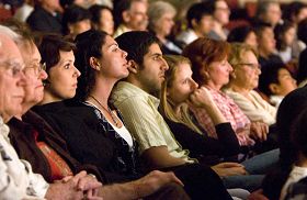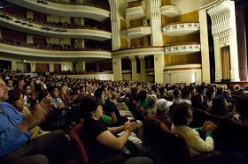 ![]() 演出结束时,现场观众纷纷起立长时间鼓掌向演员致意,直至大幕落下,不再开启,才慢慢离去。 |