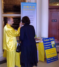 刚刚学完第一套功法,一位戴眼镜的先生连连说好。他告诉教他炼功的学员,自己读过很多有关精神修行方面的书籍。最近遇到很多很多奇特的事情令他不解,总觉得自己的生命中将要发生什么事情。他眼含热泪说,也许今天是他一生中最重要的一天。他手捧《转法轮》一口气读了很多页,遇到许多不懂的问题向旁边教功的学员询问。学员耐心地告诉他:当你读完这本书后,你现在不懂的问题都会明白的。