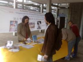 二零零九年五月二十二日,德国南部城市斯图加特和卡尔斯鲁尔的大法弟子在斯图加特大学的食堂前,举办了讲真相、反迫害和声援退党活动。