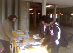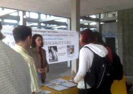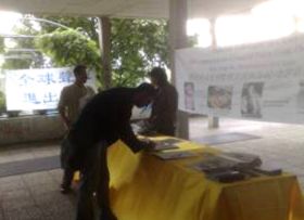 ![]() 真相桌子前,有的学生观看真相图片,有的签名支持反迫害。 |