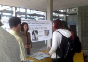 【明慧网二零零九年五月三十一日】二零零九年五月二十二日,德国南部城市斯图加特和卡尔斯鲁尔的大法弟子在斯图加特大学的食堂前,举办了讲真相、反迫害和声援退党活动。
