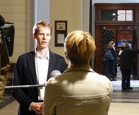 ![]() 原告之一的比利时法轮功学员尼古拉斯(Nicolas)在比利时高等法院接受比利时国家电视台采访。 |