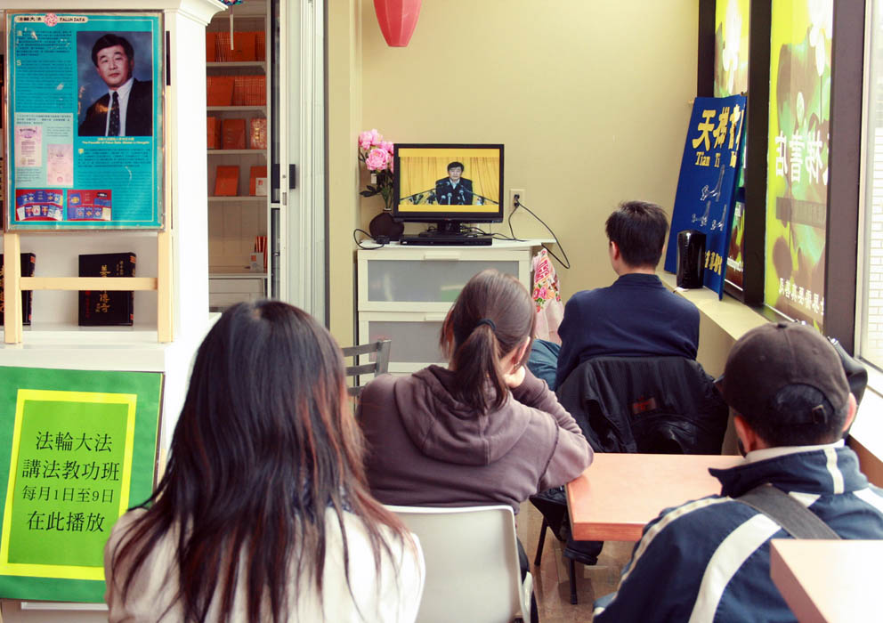 ![]() 多伦多的天梯书店开张以来,每月的一至九日开办”九天学法炼功班“,播放李洪志大师的讲法录像和教功录像。 |