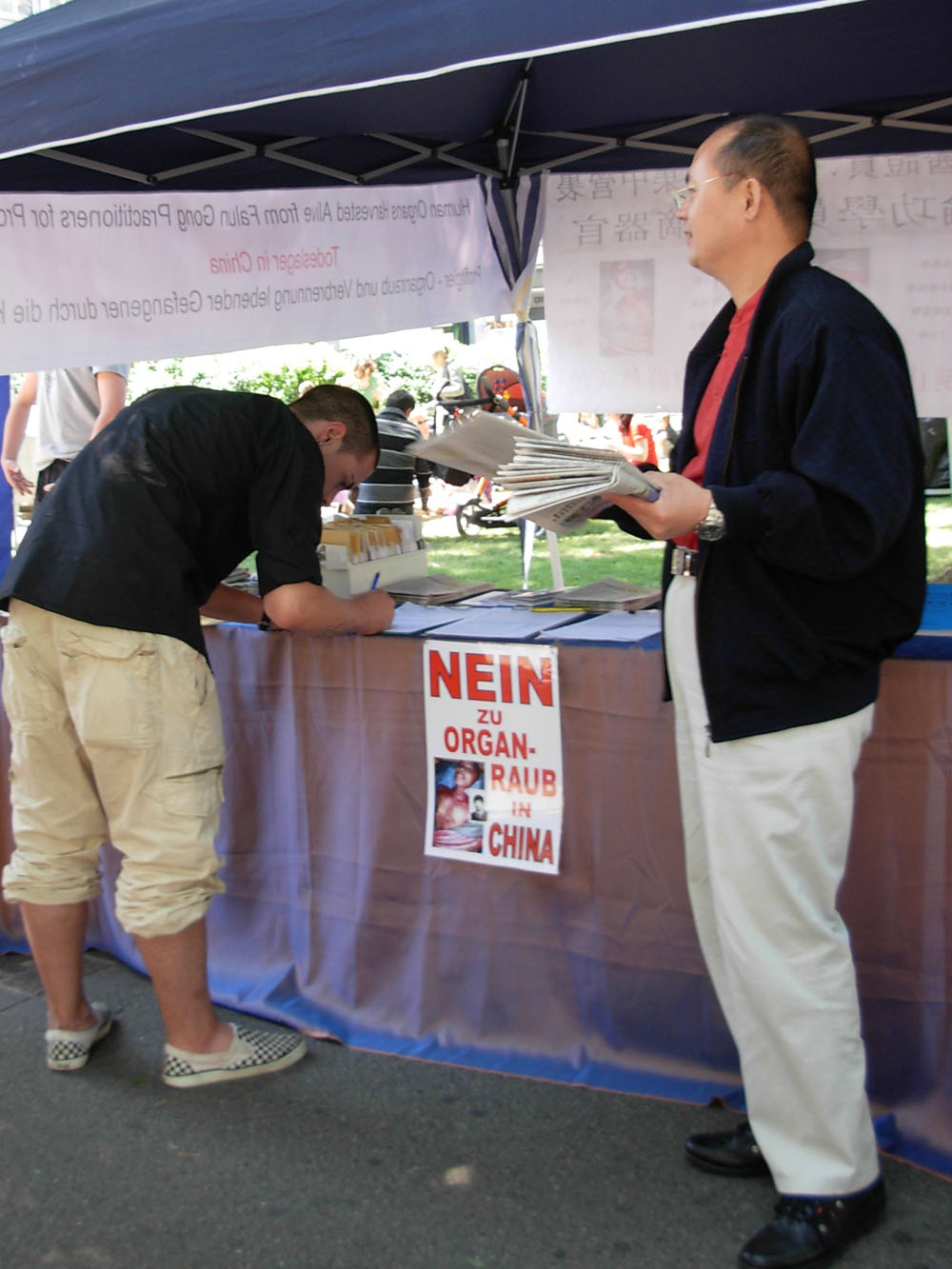 傍晚当法轮功学员收拾摊位的时候,还来了一位中年男子,他对法轮功及法轮功学员受到的迫害有一些了解,但是当听到中共活摘法轮功学员器官的罪行时,还是露出惊讶及不忍的表情。法轮功学员建议他可以上网看乔高和麦塔斯两位先生关于中共活摘器官的报告。尽管一开始他表示自己是一个怕心很重的人,并说如果他签名会不会就被中共知道,但是最后他还是主动要求签名,并带走了法轮功真相报纸和揭露中共罪行的《九评共产党》。